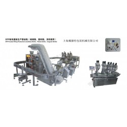 本生產線由DTGBF-1粉劑灌裝機、DTYX-111直線式搓蓋機、DTTS雙面貼標機、DTTM自動脫模機、DTGD-1式立式包裝機組成,能完成粉劑的人工上瓶、灌裝、旋蓋、貼標、脫模、入袋等工序,適用于無法直立粉劑瓶子的高速灌裝聯動生產。