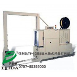 依利達TW-105B1流水線式托盤穿劍式打包機(又稱為廣州在線式全自動棧板捆扎機/深圳卡板自動輸送捆包機/東莞托盤在線式捆扎打帶機/惠州棧板無人化打包帶包裝機械/佛山全自動在線棧板捆包機/珠海側邊冰箱捆扎機):針對棧板捆包而設計,實現無人化棧板自動打包;