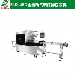 依利達ELIDA品牌ELD-48D 全自動氣調保鮮包裝機主要由機架、送膜機構,送盒機構、進料輸送帶,出料輸送帶,定位輸送帶,真空箱體,上下模具、保鮮氣體充配氣系統、氣動執行系統、加熱模溫控系統、電氣自動控制系統組成。