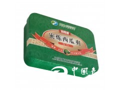 蜜煉西瓜爽含片鐵盒采用的是單面四色印刷工藝,外過亮光油,內涂金油,鐵盒表面可作雕刻工藝,文字部分為浮雕工藝處理,使得企業品牌以立體化的形式展現出來,提升產品的宣傳效應。做雕刻還有另一方面的作用,消費者直接接觸產品的同時,可提升了品牌在消費者心中的印象。