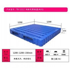 1210雙面吹塑塑料托盤的尺寸是1200*1000*150mm,本身托盤重量為17公斤【還有18公斤、19公斤、20公斤】,靜載8T,動載2T。顏色以藍色為主,也可作別的顏色如紅色,白色,黑色,橙色等,也可以刷上字體,如公司名稱是“雙面吹塑塑料托盤”,就可以在托盤上刷上“雙面吹塑”,這樣可以同過托盤為自己做一個免費的廣告。雙面吹塑塑料托盤的特點1.四面可插,操作方便;2.既適合在倉庫中互相堆垛,又適合在各類貨架上使用;3.適合各類卡車運輸,方便物料的集裝化、單元化運輸;4.方便叉車、液壓托盤車等搬運工具作業;5.配合防滑橡膠,*保*物料在搬運和運輸過程中不會滑落;6.使用壽命長,且可循壞再用;7.塑料托盤使用安全、衛生、防蟲防蛀,無需修理。