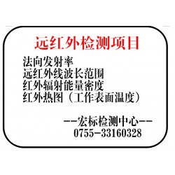 ★紅外輻射加熱器性能檢測-- ————紅外光譜發射率、電-熱輻射轉換效率、升溫時間、、輻射面溫度均勻性、溫差比、功率偏差、冷態絕緣電阻、熱態絕緣電阻、泄露電流、耐壓測試、拉力試驗、耐冷熱交變性、工作壽命、抗震性、相對輻射能譜、表面磁場、表面溫度分布(紅外熱圖)、外觀,外形尺寸、法向全發射率、 ★低溫輻射電熱膜性能檢測--- -------外觀、尺寸偏差、功率偏差、工作溫度、溫度不均勻度、升溫時間、異常溫度、工作溫度下的泄露電流、工作溫度下的電氣強度、防水等級實驗、潮濕狀態下的泄露電流、潮濕狀態下的電氣強度、冷態絕緣電阻、熱態絕緣電阻、導線的標稱橫截面積、抗拉伸性能、刮劃、剝離強度、冷彎曲性能、冷折性能、耐低溫性能、耐熱,耐燃、抗沖擊性能、墜落、電-熱輻射轉換效率、快速老化試驗、法向全發射率、紅外輻射波長范圍(輻射能譜)、表面溫度分布(紅外熱圖)、耐冷熱交換性 ★*紡織品的主要檢驗項目--- ----------法向全發射率、紅外輻射波長范圍、紅外熱圖(產品使用效果對比)、負離子濃度、磁場強度、抗菌率A、金黃色葡萄球菌B、大腸桿菌C、白色念珠菌 托瑪琳護具檢測 --------------法向全發射率、相對輻射能譜(紅外輻射波長范圍)曲線 (分光測量波長范圍 2.5~25.0 μm) 紅外熱圖(包括產品工作熱圖、人體使用前后熱圖) 紅外輻射能量密度 負離子濃度 磁場強度