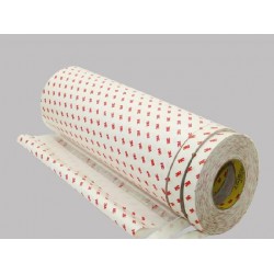 規格為:1219MM*55M*0.15MMT,具有耐久性,耐溫性好,短期耐溫性150℃,長期耐溫性120℃;防水性,回彈性好,初粘性和持粘性好,尺寸穩定性好,離型紙為白色離型紙,帶紅色“3M”LOGO;易模切加工,對塑膠、橡膠、銘牌均有良好的粘性
