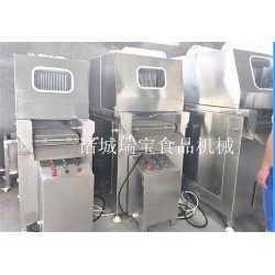 鹽水注射機有氣動、機械、變頻等幾種。鹽水注射機是將鹽水及輔料通過鹽水注射、真空滾揉,注入肉中的料液充分腌漬,滲透,疏松肌肉組織結構,有利于肌球蛋白溶出,并且由于添加劑對原料肉離子強度的增強作用和蛋白等特點的調整作用,注入配制的水溶液能使肉質嫩化、松軟,從而提高了肉制品的出品率和改善肉制品的嫩度和口感。 可根據不同工藝要求,調整步進速度,步進距離,壓肉板間隙及注射壓力,將腌漬液均勻連續地注入肉中,達到理想的注射效果。
