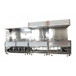 深圳威固特VGT-1007FT為光學玻璃超聲波清洗機,設備共有10個功能槽,配置有循環過濾系統、自動恒溫系統、拋動系統、超聲波清洗系統、抽風裝置等組成。清洗部分設獨立電器控制柜,設備采用水溶劑洗滌、純水漂洗、離心脫水(另附)干燥,為環保型清洗機。