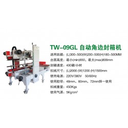 TW-09GL性能特點:換帶容易,維修保養容易,水平封箱方式,封箱整齊美觀單向側面移動,動作順暢無噪音,寬度變更采用自動升降設計 |