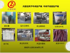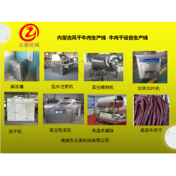 全套牛肉干加工設備有切肉機,鹽水注射機,滾揉機,油炸機,甩油機,真空包裝機,高溫滅菌鍋,風干機,具體的可以根據客戶的產量加工定制,有小型的也有大型的。