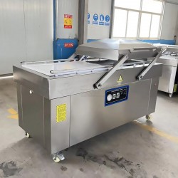 醬板鴨真空機 鴨肉干真空封口機 燒雞真空封口機 當一個真空室在抽真空室時,另一個真空室可以擺放包裝物;熟食全自動真空包裝機適用于較大規模生產型企業的產品包裝。