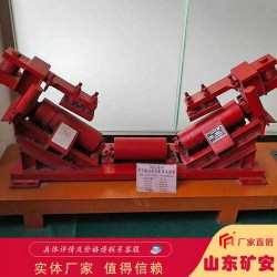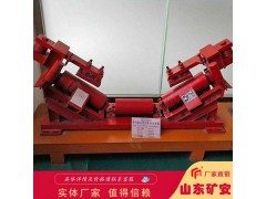 斷帶抓捕器是利用帶斷或逆止器失效后沿傾斜方向下滑產生的摩擦力為驅動源,對膠帶沿線任何隨機性的斷帶都能有效地把上、下重空段膠帶抓捕住,防止由此引發的重大經濟損失和人身事故。有上、下斷帶抓捕兩部分組成,主要采用了離心撥爪無接觸磨損觸發托輥、擺脫重載段貨載影響的制動梁敞開式可擺動機構、傳動與死點閉鎖用的四連桿機構、以及各種偏心輥和圓柱輥。在正常工作具有托輥使用功能和防跑偏功能,可廣泛用于礦山、港口、碼頭、電廠等上運的普通型和強力型膠印帶輸送機上。kuangan002