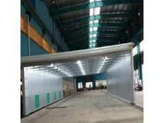 整體移動式噴漆房的設計目的,是為了較大型工件打磨或噴漆的需要。一般情況下每套房體對應2-3個排風凈化工位,哪個工位上的工件需要噴漆時,房體則行走移動到那個工位,其他工位可以繼續打磨工作,待房體內的工件噴漆完畢后,再控制移動房體行走到打磨完畢的工件工位,如此設計可以實現大型工件的不間斷連續噴漆工作。房體為鋼結構構造,房體立柱設置有兩臺電動驅動行走機構,行走機構沿地面軌道行走。移動房體兩端設置有電動卷簾大門,房體行走時,大門升起,待到達位置時,大門降落關閉。大門與行走機構由電氣控制部分連鎖控制,大門升起后,房體才可移動行走。