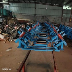 斷帶抓捕器是利用帶斷或逆止器失效后沿傾斜方向下滑產生的摩擦力為驅動源,對膠帶沿線隨機性的斷帶都能地把上、下重空段膠帶抓捕住,防止由此引發的重大經濟損失和人身事故。通用的滑軌式斷帶抓捕器 礦用斷帶抓捕器在偏心輪與下托輥之間形成制動機構,對下膠帶進行全斷面的制動,本實用新型的主要內容由上斷帶抓捕和下斷帶抓捕兩部組成,上斷帶抓捕主要在中空的支架中部布置了一個托輥,在兩側各布置一個離心撥爪無接觸磨損的摩擦偏心輪。,拖動制動機構對斷帶實施強有力抓捕制動,是一種既又斷帶抓捕裝置,本實用新型的優點是制動機構為框架式結構,獨立于輸送機機架外安裝,實施抓捕制動時不會損壞輸送機機架,且斷帶在兩側框架約束的范圍內擺動,壓緊機構對斷帶全橫斷面加力壓緊。,隔爆型電控箱設有故障診斷故障警系統聯鎖和過載過流保護功能斷帶檢測傳感器在斷帶后短的時間內采集模擬信號,傳送到隔爆型電控箱,設置佳制動時機,通過箱內處理后,發出控制指令,電磁閥按順序動作換向,執行油缸快速工作。有上、下斷帶抓捕兩部組成,主要采用了離心撥爪無接觸磨損觸發托輥、擺脫重載段貨載影響的制動梁敞開式可擺動機構、傳動與死點閉鎖用的四連桿機構、以及各種偏心輥和圓柱輥。在正常工作具有托輥使用功能和防跑偏功能,可用于礦山、港口、碼頭、電廠等上運的膠印帶輸送機上。